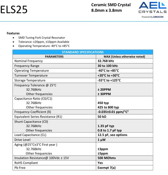 艾爾晶振,ELS25晶振,ELS25-32.768kHz-1-T晶振,貼片表晶32.768K系列具有超小型,薄型,質地輕的表面貼片音叉型石英晶體振蕩器,晶振產品本身具備優良的耐熱性,耐環境特性,在辦公自動化,家電領域,移動通信領域可發揮優良的電氣特性,符合無鉛標準,滿足無鉛焊接的回流溫度曲線要求,金屬外殼的石英晶振使得產品在封裝時能發揮比陶瓷晶振外殼更好的耐沖擊性能.自1991年以來,AEL晶振有限公司已發展成為歐洲領先的頻率控制組件供應商之一。我們的成功基于扎實的工程知識基礎,同時也為我們的客戶提供高效的總體供應鏈管理服務。無論您身在何處,無論您是在英國設有研發機構還是在遠東地區生產,您都可以確信AEL晶振將始終以具有全球競爭力的價格為您提供始終如一的質量和可靠的服務。