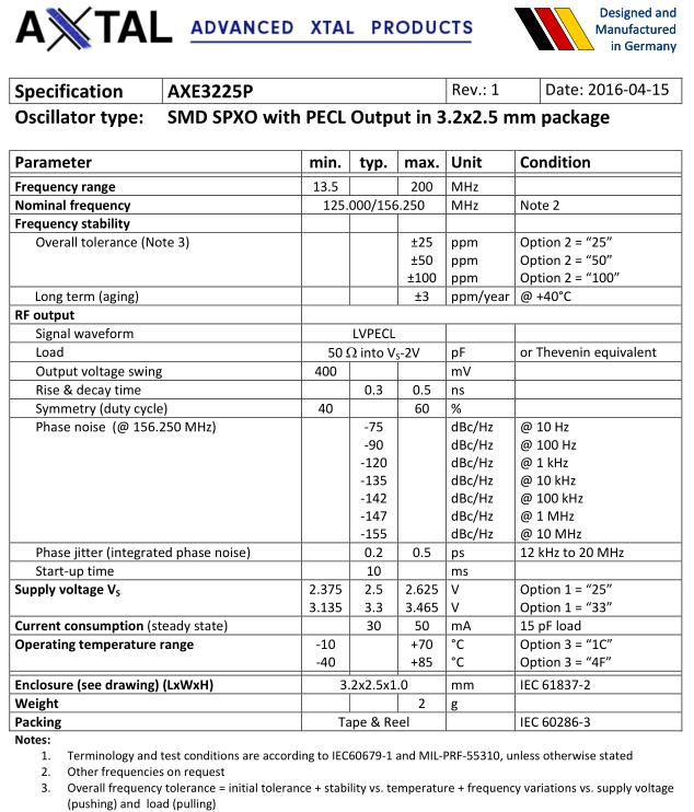 | Phase noise (@ 156.250 MHz) | ‐75 | dBc/Hz | @ 10 Hz | ||