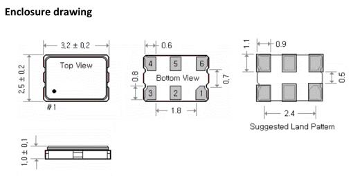 | Enclosure (see drawing) (LxWxH) | 3.2x2.5x1.0 | mm | IEC 61837‐2 | ||