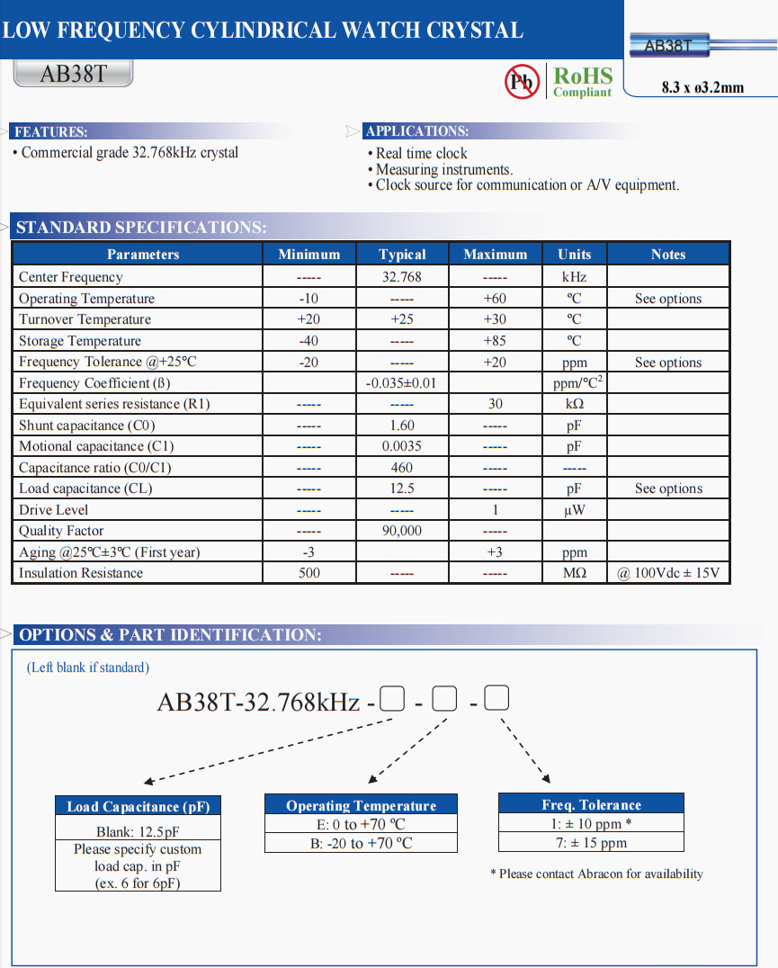 | AB38T-32.768KHZ | Abracon | AB38T | 32.768 kHz | ±20ppm | 12.5 pF | |