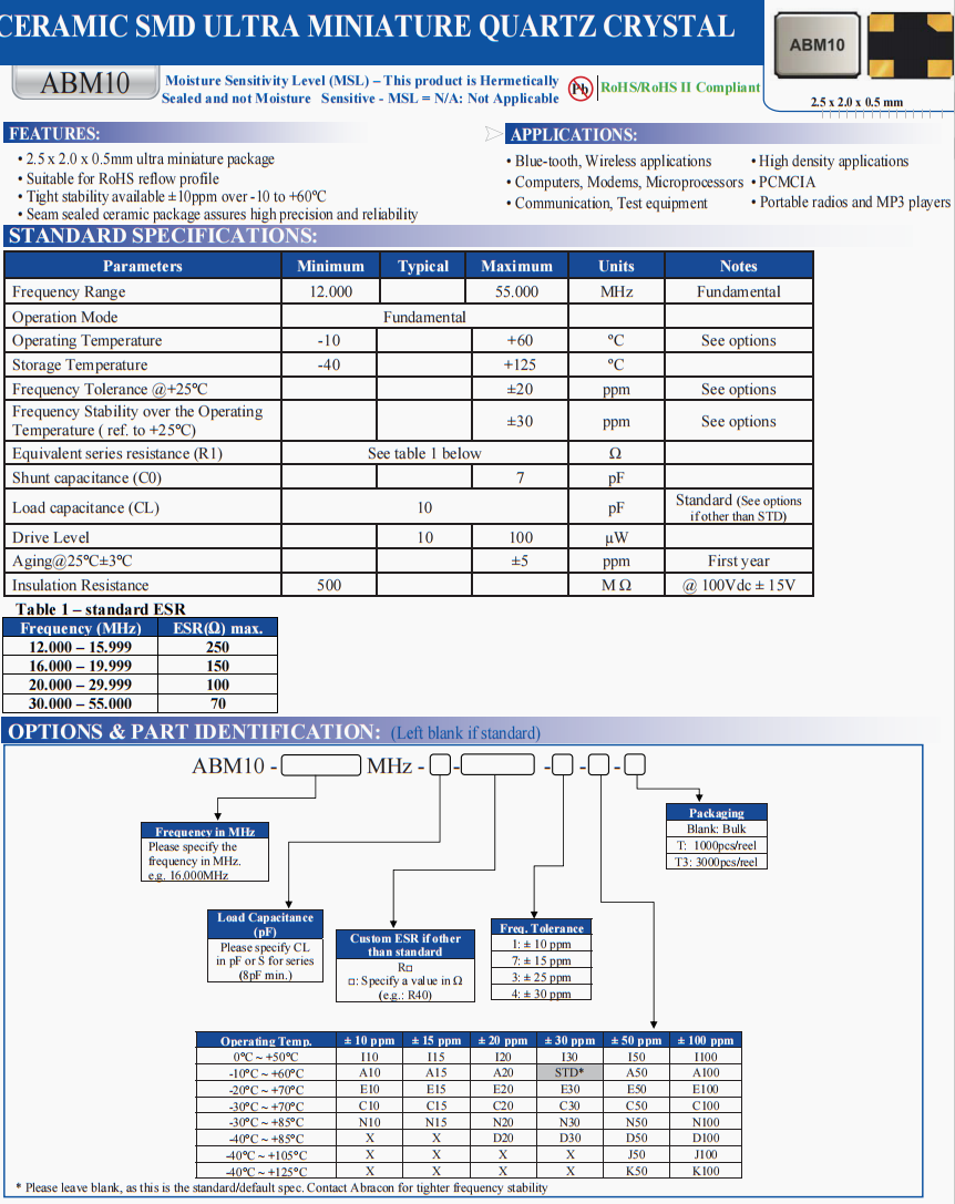 | ABM10-16.000MHZ-E20-T | Abracon | ABM10 | 16 MHz | ±20ppm | ±20ppm | 10 pF |