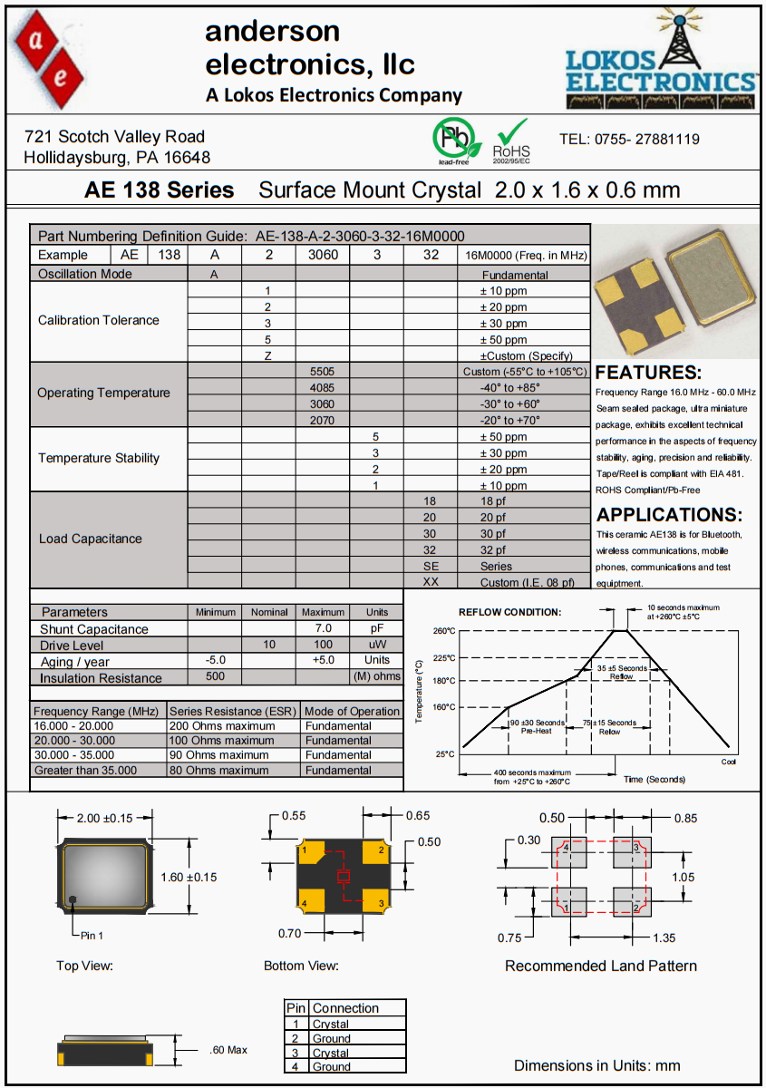 安德森美國晶振,6G信號發(fā)射器晶振,AE-138-A-2-3060-3-32-24M0000貼片晶振,美國Anderson晶振公司,安德森晶振,頻率范圍16.0 MHz - 60.0 MHz Seam密封封裝,超小型封裝,在頻率穩(wěn)定性、老化性、精度和可靠性方面具有優(yōu)異的技術性能。磁帶/卷軸符合EIA 481標準。該陶瓷AE138適用于藍牙,無線通信,移動電話,通信和測試設備等其他IT產(chǎn)品的晶振應用,三態(tài)功能,PC和LCDM等高端數(shù)碼領域,符合RoHS/無鉛。進口晶振,AE-138晶振,無源晶振,貼片晶振,超小型晶振,2016晶振,6G通訊設備晶振,6G路由器晶振,6G網(wǎng)絡終端晶振,無源晶振,貼片晶振,無人機晶振,汽車輔助駕駛晶振,低損耗晶振,高品質(zhì)晶振。