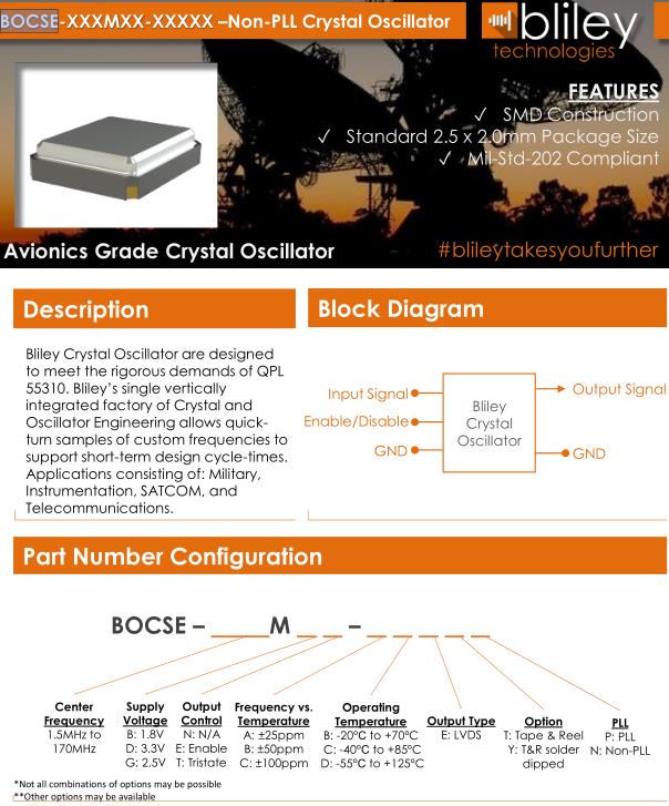 Bliley晶振,BOCSE晶振,BOCSE-26.000MEB-ACETP晶振,有源晶振,是指晶體本身起振需要外部電壓供應(yīng),起振后可直接驅(qū)動CMOS集成電路,產(chǎn)品本身已實現(xiàn)與薄型IC(TSSOP封裝,TVSOP封裝)同樣的1mm厚度,斷開時的消費電流是15µA以下,編帶包裝方式可對應(yīng)自動搭載及IR回流焊接(無鉛對應(yīng))產(chǎn)品有幾種電壓供選1.8V,2.5V,3V3.3V,5V,以應(yīng)對不同IC產(chǎn)品需要.Bliley晶振公司發(fā)展歷史: