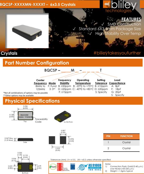 Bliley晶振,BQCSP晶振,BQCSP-26.000M-FBBFT晶振,貼片晶振本身體積小,超薄型石英晶體振蕩器,特別適用于有目前高速發展的高端電子數碼產品,因為晶振本身小型化需求的市場領域,小型,薄型是對應陶瓷振蕩器(偏差大)和普通的石英晶體振蕩器(偏差小)的中間領域的一種性價比較出色的產品.產品廣泛用于筆記本電腦,無線電話,衛星導航SSD,USB,Blu-ray等用途,符合無鉛焊接的高溫回流焊曲線特性.Bliley晶振公司發展歷史: