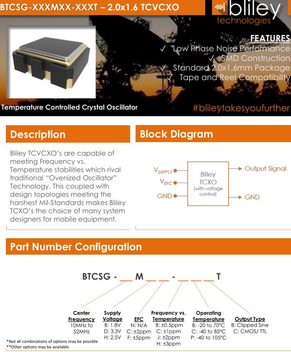 Bliley晶振,BTCSG晶振,BTCSG-16.000MDF-CBBT晶振,2016mm體積的溫補(bǔ)晶振(TCXO),是目前有源晶振中體積最小的一款,產(chǎn)品本身帶溫度補(bǔ)償作用的晶體振蕩器,該體積產(chǎn)品最適合于GPS,以及衛(wèi)星通訊系統(tǒng),智能電話等多用途的高穩(wěn)定的頻率溫度特性晶振.為對應(yīng)低電源電壓的產(chǎn)品.(DC+1.8V±0.1Vto+2.9V±0.1V對應(yīng)IC可能)高度:最高0.8mm,體積:0.0022cm3,重量:0.008g,超小型,輕型,低消耗電流,表面貼片型產(chǎn)品.(可對應(yīng)回流焊)無鉛產(chǎn)品.滿足無鉛焊接的高溫回流溫度曲線要求,帶有AFC(頻率控制)功能,Enable/Disable功能,產(chǎn)品本身可根據(jù)使用需要進(jìn)行選擇.Bliley Technologies Inc. 最初于 1930 年作為 Bliley Piezo-Electric Company 成立。最初,我們?yōu)闃I(yè)余無線電市場制造石英晶體。在 1930 年代中期,我們的客戶和產(chǎn)品很快擴(kuò)大到與新興的軍事和商業(yè)通信領(lǐng)域的利益相匹配,我們的名稱更名為 Bliley Electric Company。1939 年,我們是最大的水晶公司,擁有 11 名員工。