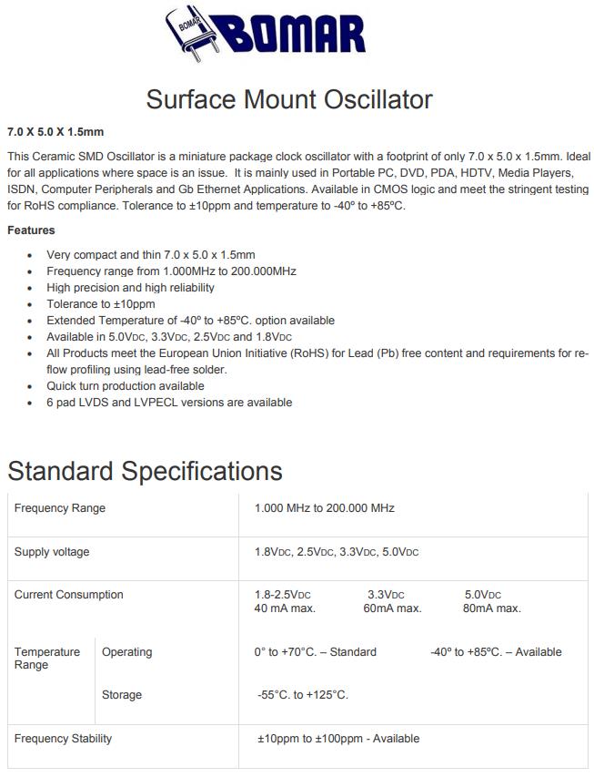 Bomar晶振,B1325-AACS3T-10.000000晶振,時鐘振蕩器,小型SMD有源晶振,從最初超大體積到現(xiàn)在的7050mm,6035mm,5032mm,3225mm,2520mm體積,有著翻天覆地的改變,體積的變小也使產(chǎn)品帶來了更高的穩(wěn)定性能,接縫密封石英晶體振蕩器,精度高,覆蓋頻率范圍寬的特點,SMD高速自動安裝和高溫回流焊設(shè)計,Optionable待機輸出三態(tài)輸出功能,電源電壓范圍:1.8V~5V,高穩(wěn)定性,低抖動,低功耗,主要應(yīng)用領(lǐng)域:無線通訊,高端智能手機,平板筆記本W(wǎng)LAN,藍牙,數(shù)碼相機,DSL和其他IT產(chǎn)品的晶振應(yīng)用,三態(tài)功能,PC和LCDM等高端數(shù)碼領(lǐng)域,符合RoHS/無鉛.Bomar成立于 1963 年,是一家為商業(yè)和雙向無線電行業(yè)生產(chǎn)石英晶體的制造商。該業(yè)務(wù)的性質(zhì)要求在寬頻率范圍內(nèi)具有嚴格的容差和高穩(wěn)定性晶體,以滿足嚴格的 FCC 規(guī)范。快速生產(chǎn)的需求對我們不斷增長的客戶群很重要。我們的許多客戶都是當?shù)亍⒅莺吐?lián)邦警察和監(jiān)視機構(gòu)。Bomar 很快不僅成為該市場的領(lǐng)先供應(yīng)商,而且因其產(chǎn)品質(zhì)量、快速周轉(zhuǎn)時間和無與倫比的客戶服務(wù)而獲得一致認可。