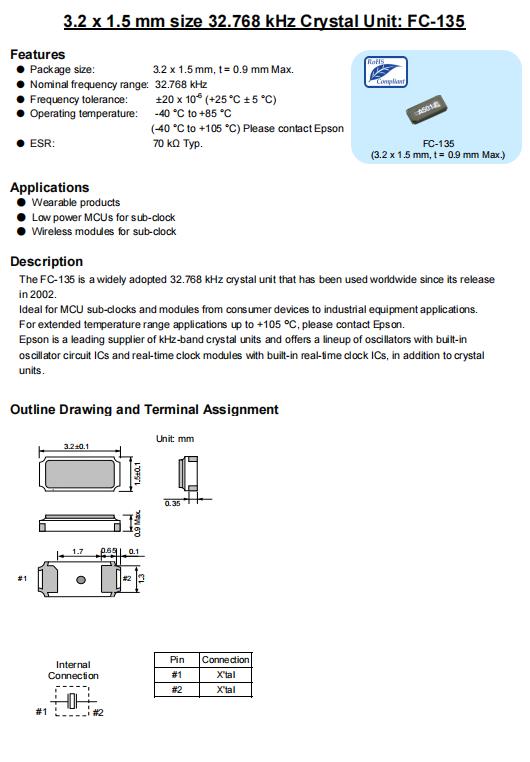 | Q13FC1350003900 | 3.2 x 1.5 x 0.9 mm | FC-135 | 32.768kHz | 7.5 pF | +/-10.0 ppm | -40 to +85 °C |