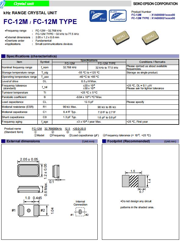 | X1A000061000600 | 2.05 x 1.2 x 0.6 mm | FC-12M | 32.768kHz | 7 pF | +/-20.0 ppm | -40 to +85 °C |
