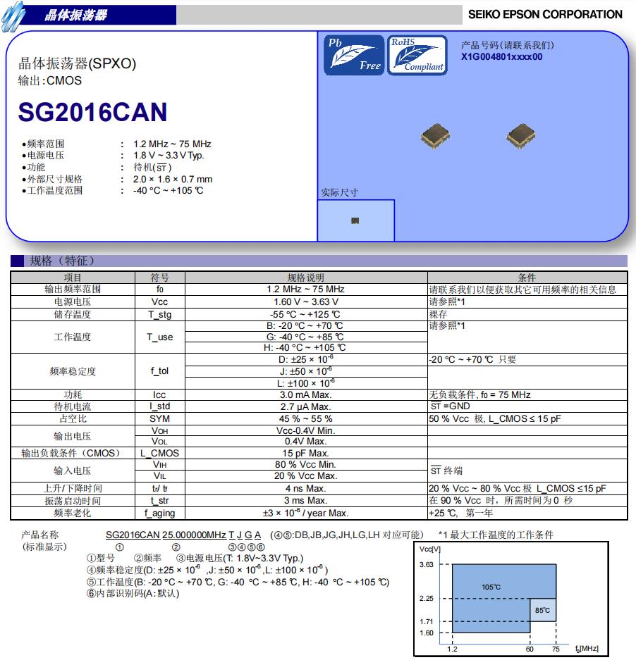 | X1G0048010056 | 愛普生振蕩器 | SG2016CAN | 16.000000 MHz | 2.00 x 1.60 x 0.70 mm | CMOS | 1.600 to 3.630 V | -40 to 105 °C | +/-50 ppm |