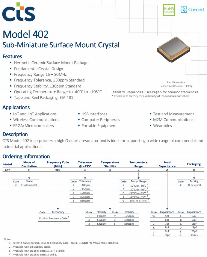 | 402F4001XIAR | CTS晶振 | 402 | MHz Crystal | 40MHz | 4-SMD, No Lead |