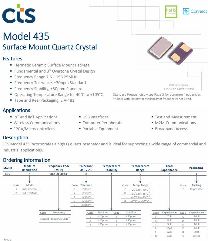 CTS 435型集成了高Q石英晶體諧振器,是支持廣泛的商業(yè)和工業(yè)應(yīng)用。
