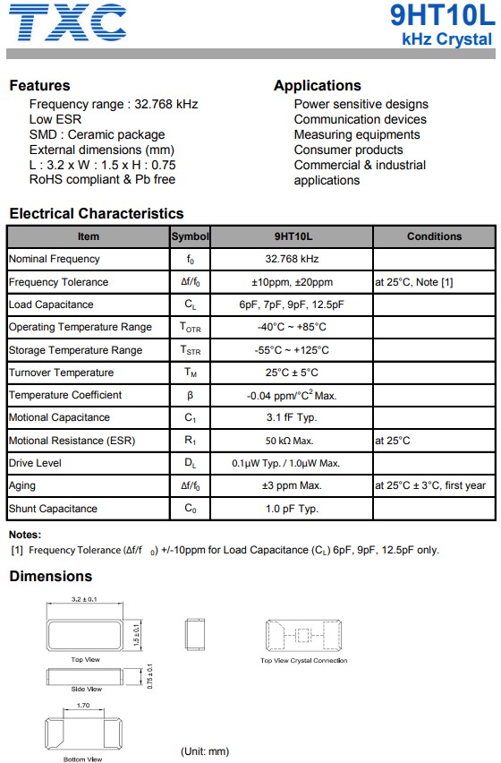 | 9HT10-32.768KBZF-T | TXC Crystal | 9HT10 | kHz Crystal (Tuning Fork) | 32.768kHz |