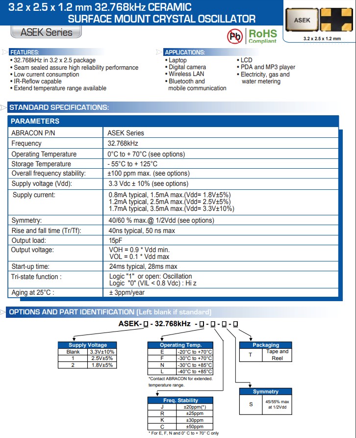 | ASEK-32.768KHZ-LRT | Abracon Crystal | ASEK | XO (Standard) | 32.768kHz | 3.3V |