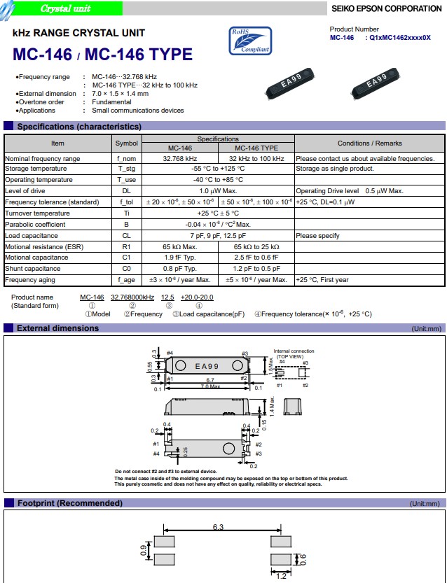 | Q13MC1462000200 | 7x1.5x1.4mm | MC-146 | 32.768kHz | 12.5pF | +/-20.0ppm | -40 to +85°C |