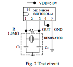 陶瓷諧振器的測試電路陶瓷諧振器:帶內置電容器:它由帶有反饋電阻Rf的CMOS反相器組成(圖2).反饋電阻允許在最初施加電源時啟動振蕩.其值通常為1MΩ.Cl和C2的值在表中給出或由客戶指定.