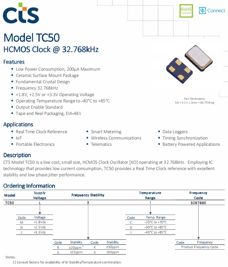 32.768K振蕩器TC50V5C32K7680具有低相位抖動性能的實時時鐘參考,CTS晶振型號TC50,是一款小尺寸5.0x3.2x1.3mm封裝,四腳貼片晶振,有源晶振,石英晶體振蕩器,HCMOS時鐘振蕩器[XO],頻率32.768kHz,TC50采用了提供低電流消耗的IC技術,提供了一個具有優異的穩定性和低相位抖動性能的實時時鐘參考。