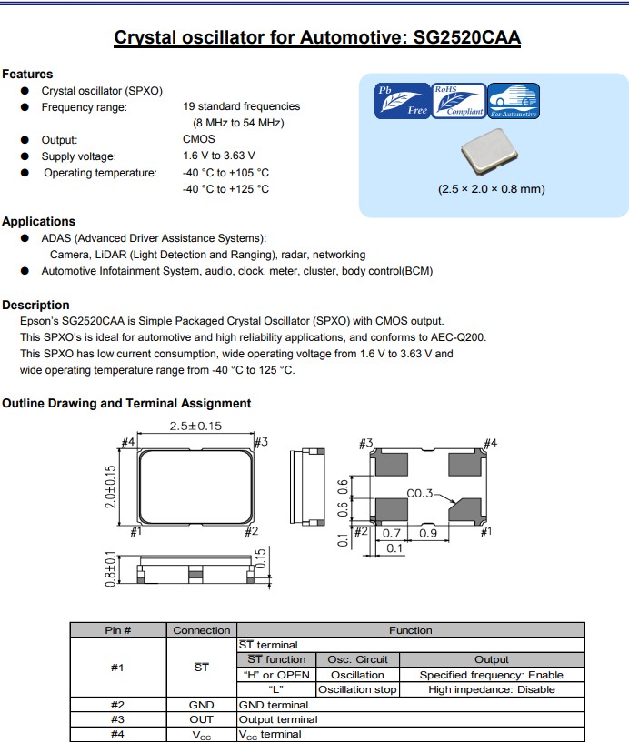 愛(ài)普生晶振SG2520CAA是具有CMOS輸出的簡(jiǎn)單封裝石英晶體振蕩器(SPXO)。 小體積晶振尺寸2.5x2.0mm四腳貼片晶振,這款SPXO非常適合汽車和高可靠性應(yīng)用,符合AEC-Q200標(biāo)準(zhǔn)。 該SPXO具有低功耗、1.6V至3.63V的寬工作電壓以及40°C至85°C的寬工作溫度范圍,此外還可提供高達(dá)125°C的工作溫度,輸出頻率范圍在8MHz至54MHz,該產(chǎn)品具有超小型,輕薄型,低電壓晶振,高精度,高性能,高品質(zhì)等特點(diǎn),適用于ADAS(高級(jí)駕駛輔助系統(tǒng)): 攝像頭、激光雷達(dá)(光探測(cè)和測(cè)距)、雷達(dá)、網(wǎng)絡(luò) ,汽車信息娛樂(lè)系統(tǒng)、音頻、時(shí)鐘、儀表、組合儀表、車身控制(BCM)等。