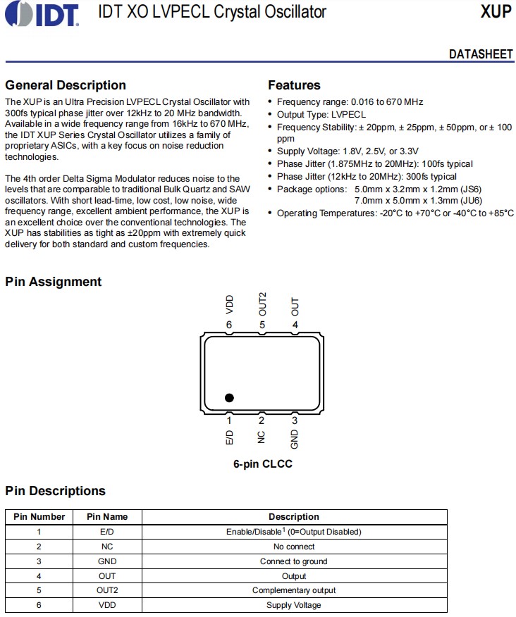 | XUP535125.000JS6I | IDT晶振 | LVPECL | 3.3V | OSC 125MHZ SMD |