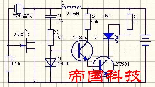 晶振檢驗(yàn)電路,2N3823結(jié)型N溝道效場應(yīng)管(可用任何型其它型號的同類小功率場效應(yīng)管,如 3DJ6、3DJ7等)于被測晶體(晶振、石英晶振、32.768K、表晶)等組成一個振蕩器,兩個兩個NPN三極管2N3904(也可用任何型號其它小功率NPN三極管)接成復(fù)合檢波放大器,驅(qū)動發(fā)光二極管LED,若被測晶振良好時,振蕩器起振,其震蕩信號經(jīng)0.01uF的電容藕合至檢波放大器的輸入端,經(jīng)放大后驅(qū)動發(fā)光二極管發(fā)光,如果被檢晶振不好,則晶振不起振,發(fā)光二極管就不發(fā)光。