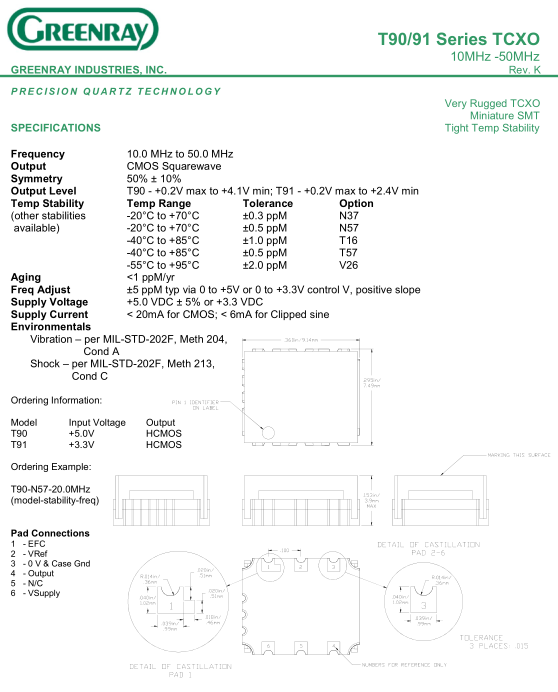 Greenray晶振,T90晶振,T90-N57-20.0MHz晶振,溫補晶振(TCXO)產品本身具有溫度補償作用,高低溫度穩定性:頻率精度高0.5PPM-2.0PPM,工作溫度范圍:-30度至85度,電源電壓:1.8V-3.3V之間可供選擇,產品本身具有溫度電壓控制功能,世界上最薄的晶振封裝,頻率:26兆赫,33.6兆赫,38.4兆赫,40兆赫,因產品性能穩定,精度高等優勢,被廣泛應用到一些比較高端的數碼通訊產品領域,GPS全球定位系統,智能手機,WiMAX和蜂窩和無線通信等產品,符合RoHS/無鉛.Greenray格林雷晶振集團所生產的石英晶振,貼片晶振,石英晶體振蕩器工作溫度范圍較廣在-55+125°C之間,Greenray格林雷OCXO晶體振蕩器的頻率穩定度在±0.005ppm較高精度,TCXO溫補晶振的頻率穩定度控制在±0.04ppm范圍的高精度,具有低相位,低抖動,低噪音等特性.