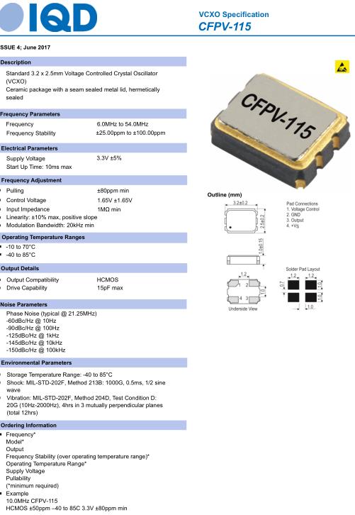- 產(chǎn)品描述:IQD晶振,CFPV-115晶振,10.0MHz-CFPV-115晶振,壓控晶振(VCXO),壓控石英晶體振蕩器基本解決方案,PECL輸出,輸出頻率60MHz到200MHz之間,出色的低相位噪聲和抖動,三態(tài)功能,應(yīng)用:SDH/SONET,以太網(wǎng),基站,筆記本晶振應(yīng)用,符合...