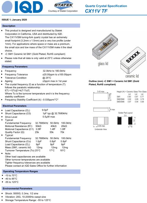 石英晶體諧振器,石英晶振被廣泛應(yīng)用于需要定時裝置的各種電子應(yīng)用中.石英晶體的質(zhì)量對石英晶體的性能至關(guān)重要,而石英的高Q系數(shù)則意味著可以實現(xiàn)緊密的性能,這是確保微處理器在客戶設(shè)計中正確工作的關(guān)鍵.IQD是一家石英晶體(XTAL),貼片晶振,有源晶振,壓控振蕩器,壓電水晶制造商,已有40多年的歷史,并提供了表貼式焊接以及插件焊接的石英晶體晶振,石英晶體諧振器,具有廣泛的頻率選用范圍,滿足幾乎所有的產(chǎn)品應(yīng)用.伊克德晶振,CX11VTF晶振,32.7680kHz-CX11VTF-C-SM1100晶振.