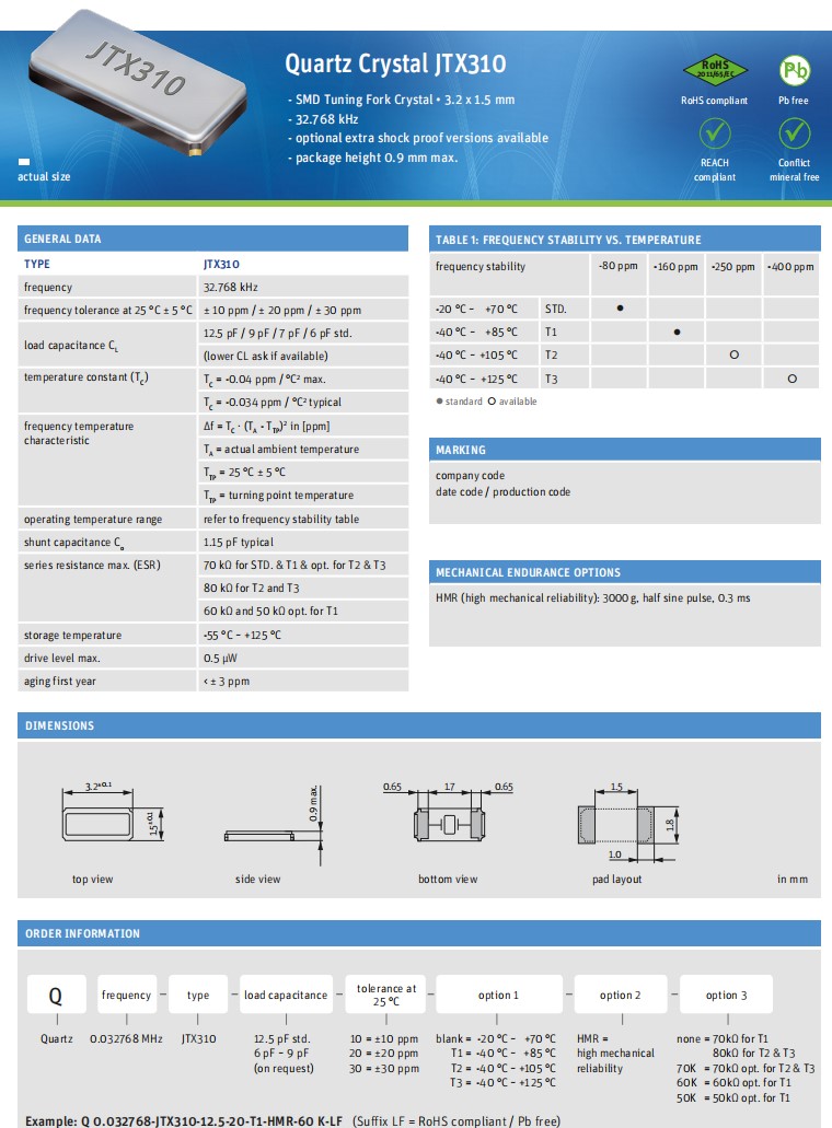 | Q 0.032768-JTX310-7-10-T1-HMR-LF | Jauch晶振 | JTX310 | 32.768kHz |