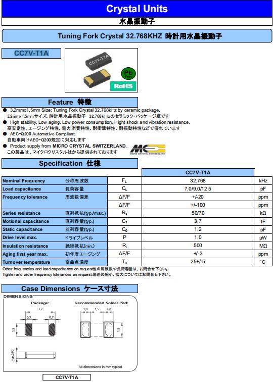| CC7V-T1A-32.768k-12.5pF-20PPM-TA-QA | Micro Crystal | 晶體 32.768 kHz 12.5 pF +/-20 PPM AEC-Q200 | Crystals | 32.768 kHz | 20 PPM | - 40 C | + 85 C | |