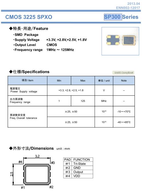 NAKA晶振,SP300晶振,SPXO晶振,小型SMD有源晶振,從最初超大體積到現在的7050mm,6035mm,5032mm,3225mm,2520mm體積,有著翻天覆地的改變,體積的變小也使產品帶來了更高的穩定性能,接縫密封石英晶體振蕩器,精度高,覆蓋頻率范圍寬的特點,SMD高速自動安裝和高溫回流焊設計,Optionable待機輸出三態輸出功能,電源電壓范圍:1.8V~5V,高穩定性,低抖動,低功耗,主要應用領域:無線通訊,高端智能手機,平板筆記本WLAN,藍牙,數碼相機,DSL和其他IT產品的晶振應用,三態功能,PC和LCDM等高端數碼領域,符合RoHS/無鉛.