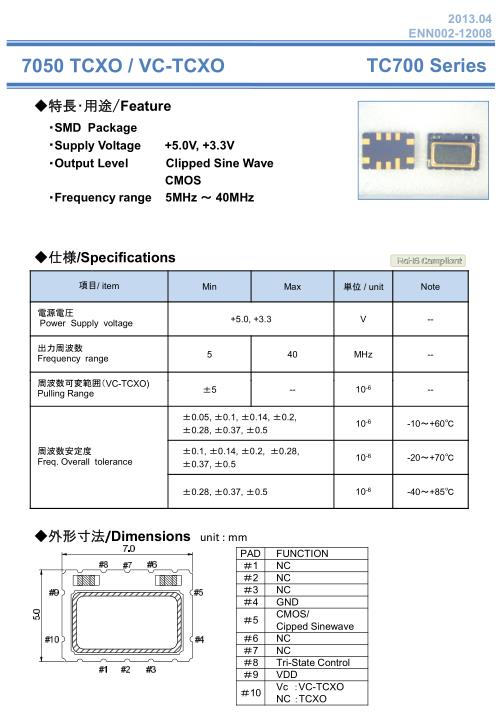 NAKA晶振,TC700晶振,溫補晶振,溫補晶振(TCXO)產品本身具有溫度補償作用,高低溫度穩定性:頻率精度高0.5PPM-2.0PPM,工作溫度范圍:-30度至85度,電源電壓:1.8V-3.3V之間可供選擇,產品本身具有溫度電壓控制功能,世界上最薄的晶振封裝,頻率:26兆赫,33.6兆赫,38.4兆赫,40兆赫,因產品性能穩定,精度高等優勢,被廣泛應用到一些比較高端的數碼通訊產品領域,GPS全球定位系統,智能手機,WiMAX和蜂窩和無線通信等產品,符合RoHS/無鉛.納卡晶振公司是使用模擬電路技術,擅長定制規格的水晶設備制造廠。有強烈要求“低相位噪聲、高頻、高信賴性”的通信設備、廣播設備、測量儀器、交通基礎設施、醫療器械、防衛設備。另外,現在已經成為問題了,對生產中止,實現長期性的產品供應,以滿足顧客未來的企業為目標。