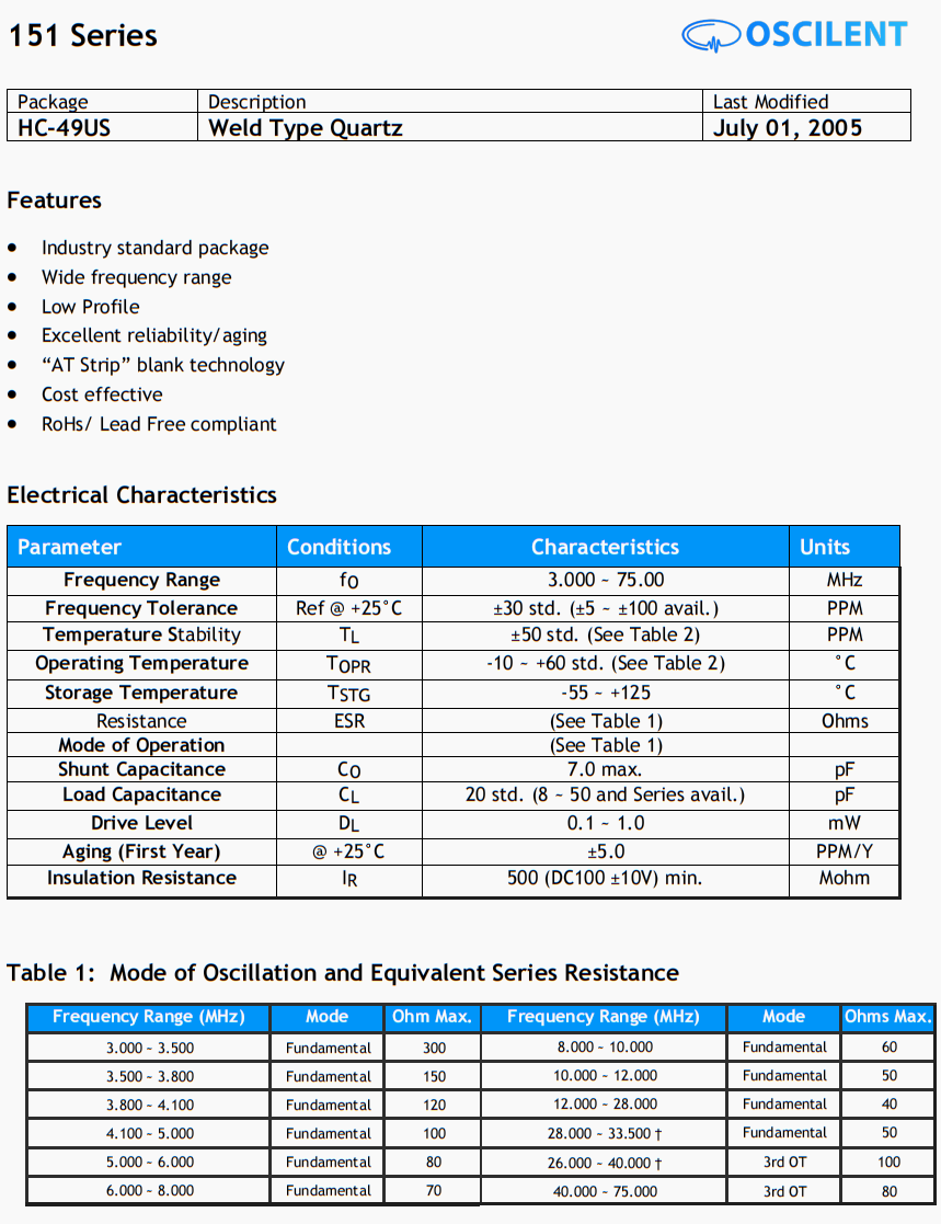 151-3.6864M-10-W-TR晶振,Oscilent美國晶振,醫療設備晶振