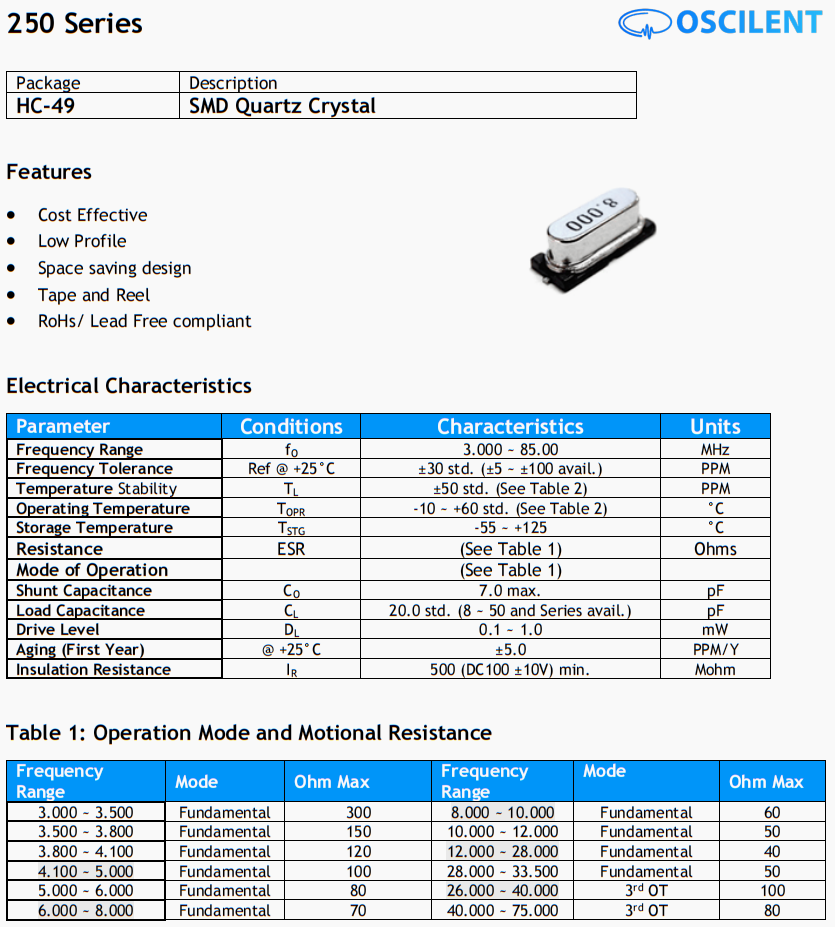 - 產(chǎn)品描述:250-4.0M-18-S-TR晶振,進口奧斯康利49SMD晶振,6G室外基站晶振,美國Oscilent晶振公司,特點,成本效益,低配置,節(jié)省空間的設(shè)計,磁帶和卷軸,符合RoHs/無鉛標準。奧斯康利晶振,歐美晶振,高品質(zhì)晶振,貼片晶振,49S...