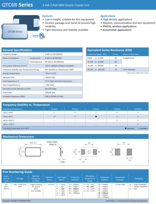 Quarztechnik晶振,QTC6B晶振,QTC6B12.0000FBT3I30R晶振,貼片晶振本身體積小,超薄型石英晶體振蕩器,特別適用于有目前高速發展的高端電子數碼產品,因為晶振本身小型化需求的市場領域,小型,薄型是對應陶瓷振蕩器(偏差大)和普通的石英晶體振蕩器(偏差小)的中間領域的一種性價比較出色的產品.產品廣泛用于筆記本電腦,無線電話,衛星導航SSD,USB,Blu-ray等用途,符合無鉛焊接的高溫回流焊曲線特性.Quarztechnik晶振公司作為德國振蕩石英晶體和振蕩器制造商已有50多年的歷史,我們生產各種產品 - 從通道晶體,振蕩石英晶體和石英振蕩器到基于壓電單晶的傳感器元件。我們的產品應用于所有類型的無線電應用,如用于制造振蕩器和壓力,溫度和質量敏感傳感器元件的精密晶體。
