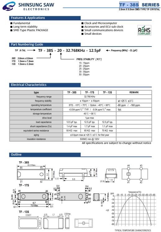 SHINSUNG晶振,TF-38S晶振,TF-38S-20-32.768KHz-12.5pF晶振,小體積SMD時鐘晶體振蕩器,是貼片音叉晶體,千赫頻率元件,應用于時鐘模塊,智能手機,全球定位系統,因產品本身體積小,SMD編帶型,可應用于高性能自動貼片焊接,被廣泛應用到各種小巧的便攜式消費電子數碼時間產品,環保性能符合ROHS/無鉛標準.