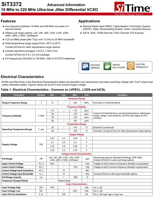 SiTime晶振,SiT3372晶振,SiT3372AC-1B2-33-H26.000000T晶振,小型SMD有源晶振,從最初超大體積到現在的7050mm,6035mm,5032mm,3225mm,2520mm體積,有著翻天覆地的改變,體積的變小也使產品帶來了更高的穩定性能,接縫密封石英晶體振蕩器,精度高,覆蓋頻率范圍寬的特點,SMD高速自動安裝和高溫回流焊設計,Optionable待機輸出三態輸出功能,電源電壓范圍:1.8V~5V,高穩定性,低抖動,低功耗,主要應用領域:無線通訊,高端智能手機,平板筆記本WLAN,藍牙,數碼相機,DSL和其他IT產品的晶振應用,三態功能,PC和LCDM等高端數碼領域,符合RoHS/無鉛.