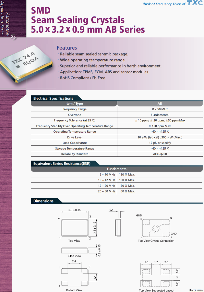 TXC臺產晶體,AB-12.000MALE-T四腳晶振,汽車胎壓檢測裝置晶振,AB系列SMD,縫封晶體,5.0* 3.2* 0.9 mm ,特點,可靠的縫封陶瓷封裝。工作溫度范圍寬。惡劣環境下性能優越可靠。應用范圍:TPMS, ECM, ABS,傳感器模塊。符合rohs標準/不含鉛臺灣TXC晶振公司,晶技晶振,無源晶振,5032晶振,AB-12.000MALE-T晶振,汽車晶振,汽車電動天窗控制系統晶振,臺灣晶振,貼片晶振,四腳晶振,石英晶振,高品質晶振,車載多媒體晶振,行車記錄儀晶振,低損耗晶振,耐高溫晶振,耐沖擊晶振。