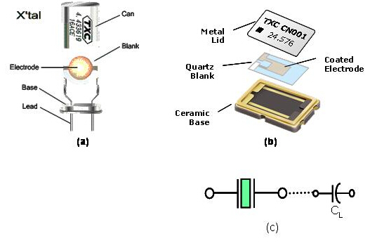 (圖一)(a)及(b)分別是DIP型式及SMD型式的石英振蕩子的基本結(jié)構(gòu)圖. (圖七)(c)是電子電路上所使用代表石英振蕩子的電子符號. 當石英晶體共振子處在遠離振蕩頻率區(qū)域時, 石英晶體共振子僅是一個電容性的組件, 當頻率接近石英晶體的振蕩頻率時, 就接近是一個電感性的等效LCR振蕩線路.