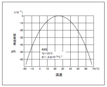 音叉型石英晶振的頻率溫度特性如左側(cè)的曲線圖所示,顯示了以+25°C為頂點的負向2次方程曲線. 溫度范圍越寬,則頻率的變化量也越大,因此,需要 考慮一下所使用環(huán)境的溫度范圍和必要的精度.[頻率溫度特性的近似公式]
