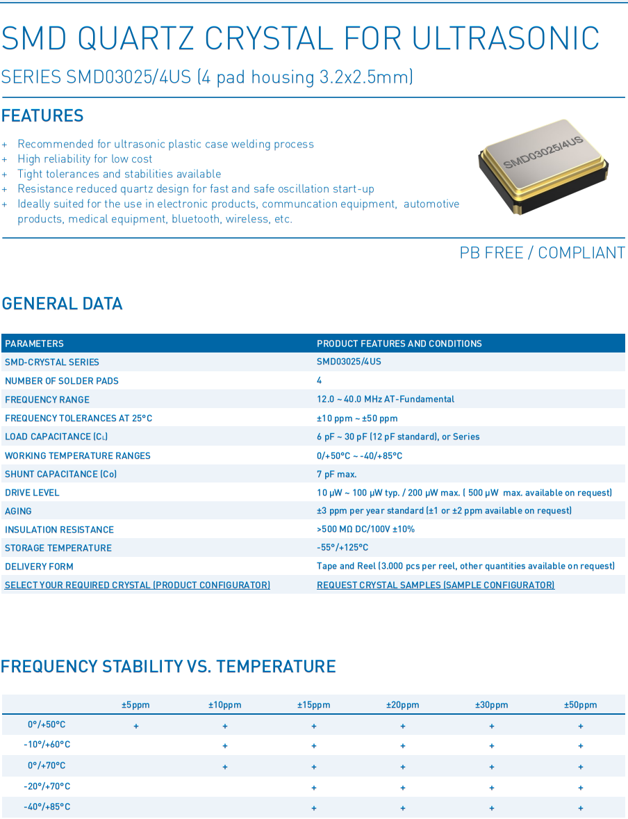 “SMD03025/4US”的頻率范圍為12-40 MHz,在+25°C時,頻率公差從±10 ppm開始,在-20/+70°C的溫度范圍內,溫度穩定性從±10 ppm開始。在工業溫度范圍-40/+85°C之外,最接近的溫度穩定性為±15 ppm。