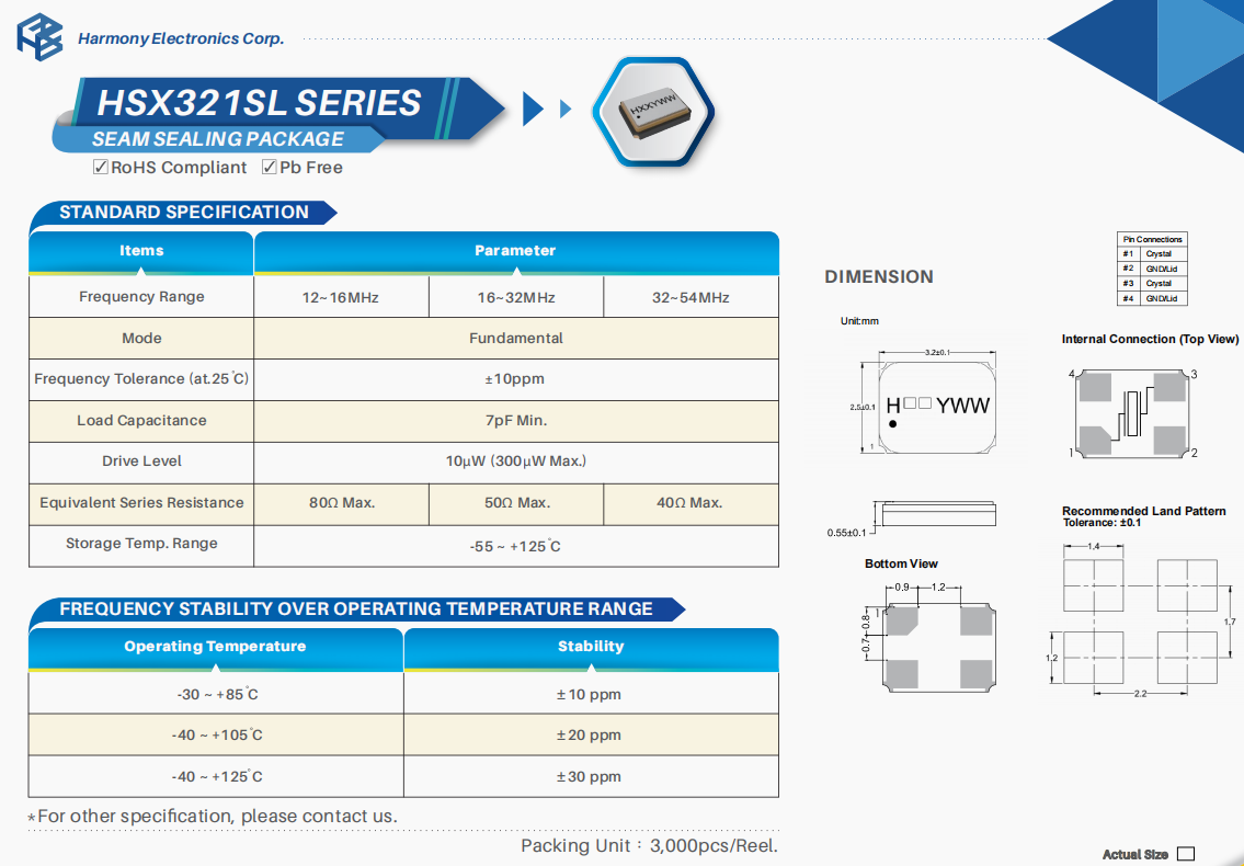 | X3S016000DC1H‐V | 加高晶振 | HSX321S | 16 MHz | ±30ppm | 12pF |