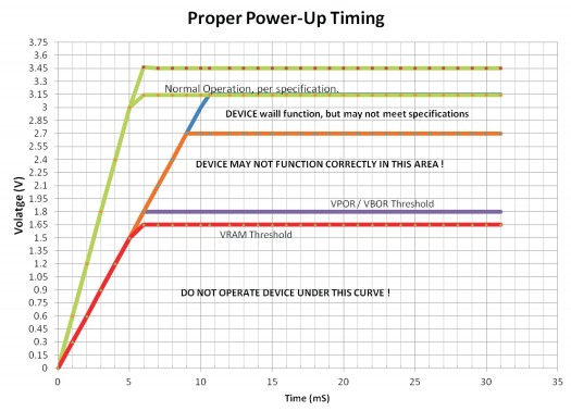 POR/BOR操作:設(shè)備啟動(dòng)時(shí)會(huì)發(fā)生上電復(fù)位從Vss級(jí)別開始,掉電情況當(dāng)先前供電的設(shè)備掉落時(shí)發(fā)生低于指定范圍,器件RAM保持電壓(VRAM)較低比VPOR/VBOR電壓跳變點(diǎn),當(dāng)VPRO /VBOR<Vcc<2.7V,電氣性能優(yōu)異恒溫晶振不符合數(shù)據(jù)手冊(cè)規(guī)范,當(dāng)設(shè)備上電時(shí),設(shè)備Vcc將越過VPOR/VBOR電壓,一旦Vcc電壓以下將超過VPOR/VBOR電壓發(fā)生:•加載易失性寄存器價(jià)值形成相應(yīng)的非易失性寄存器.•TCONF寄存器將加載出廠設(shè)置節(jié)目.•該設(shè)備具有數(shù)字/模擬功能操作.